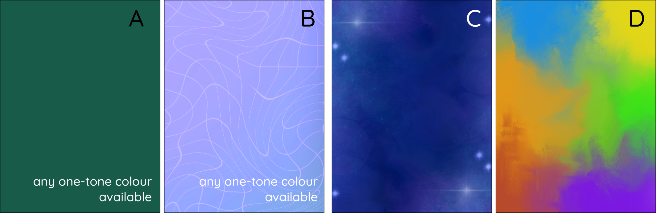 If you have a specific wish that is not listed here, select “other” and write down your wishes. For simple patterns, gradients etc. there is no extra fee. For specific backfrounds there might be an extra fee – you will receive a full breakdown of the price before you pay.